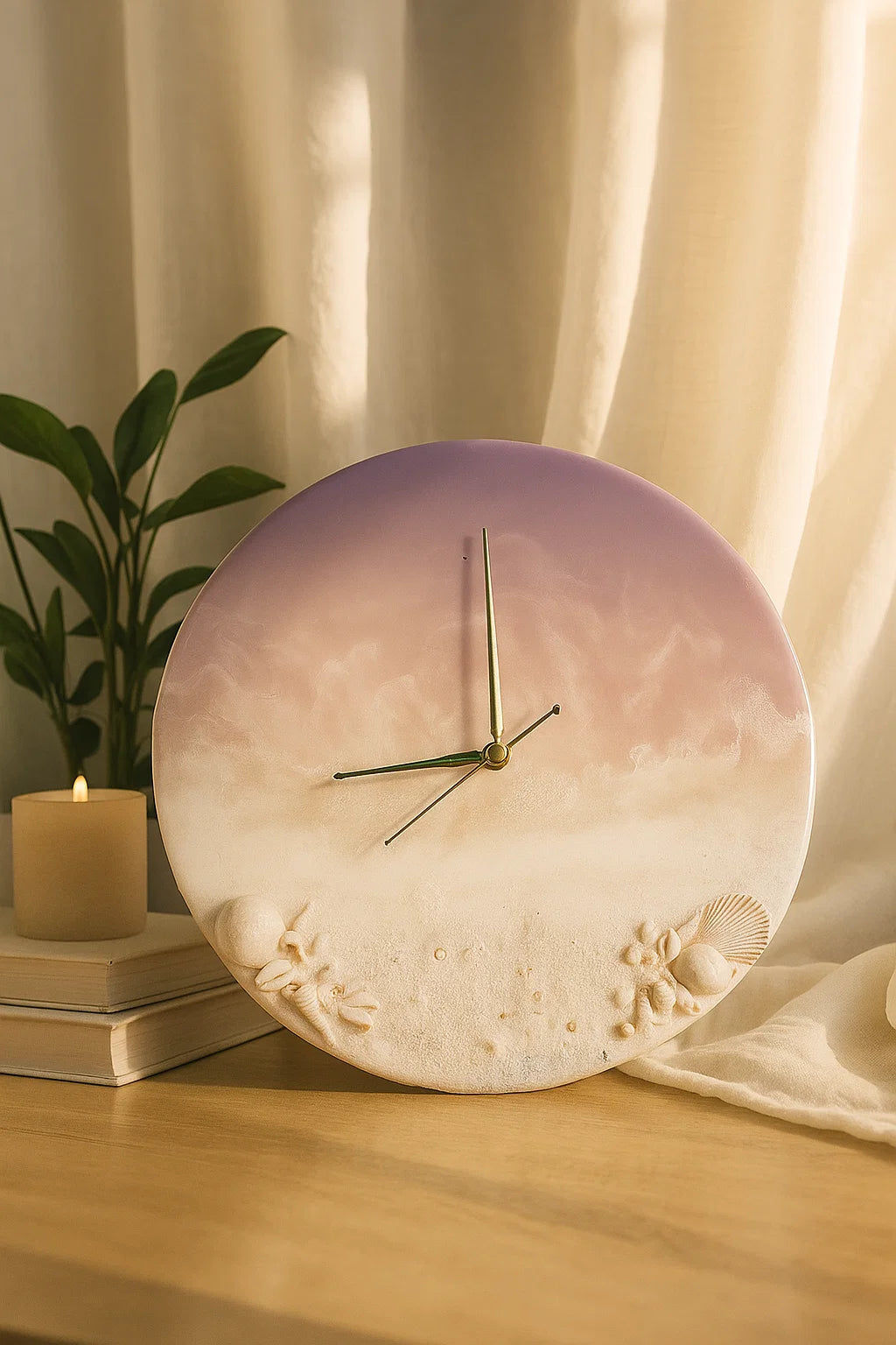 There’s something about the sky right after the sun sets — when everything softens into a blush-pink haze and the world feels slower, quieter. Afterglow captures that moment in resin, with a dreamy ombré that fades from pink to violet, blending into textured pearly sand scattered with delicate seashells.