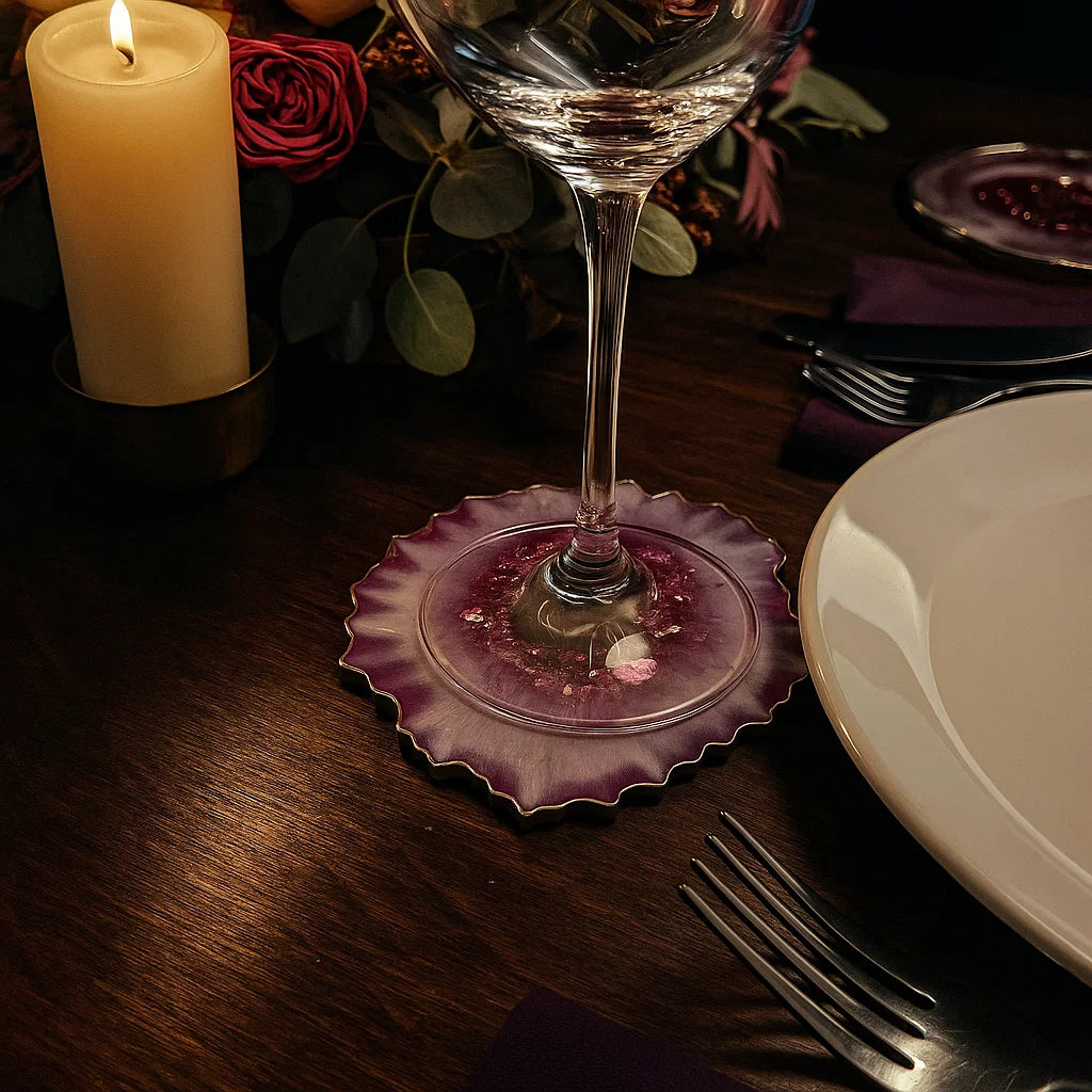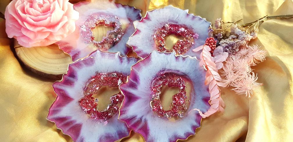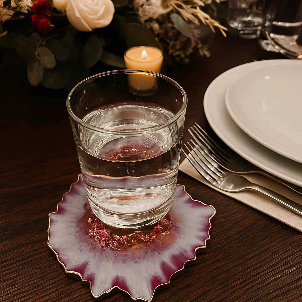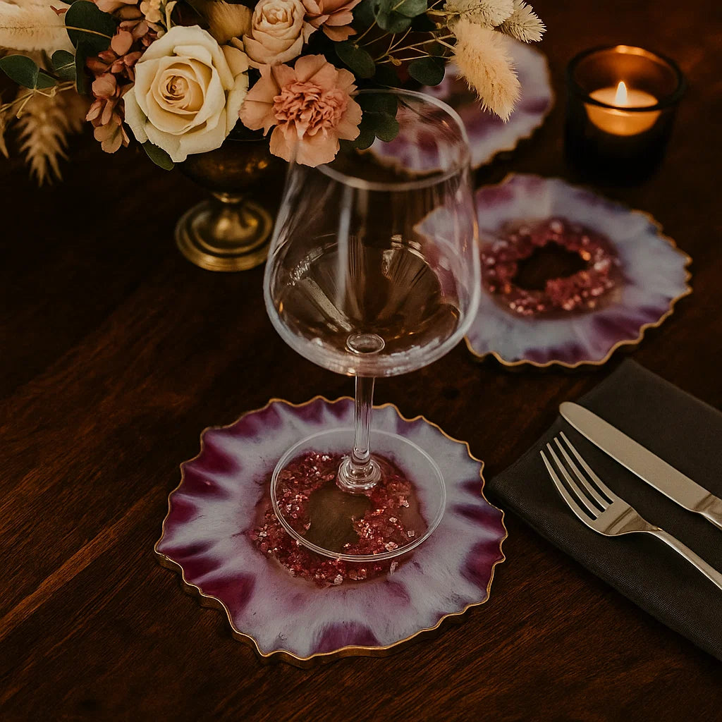 Amethyst coasters are inspired by the gentle hues of amethyst crystals, touched with shades of rose and soft violet. Their geode-like heart carries a shimmer that feels both raw and refined, like a fragment of earth shaped into art.