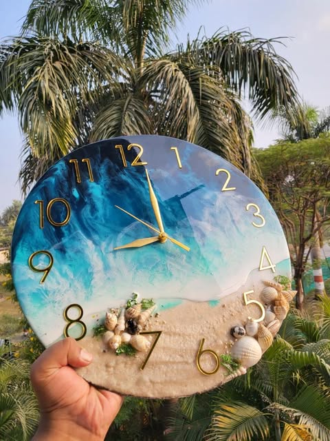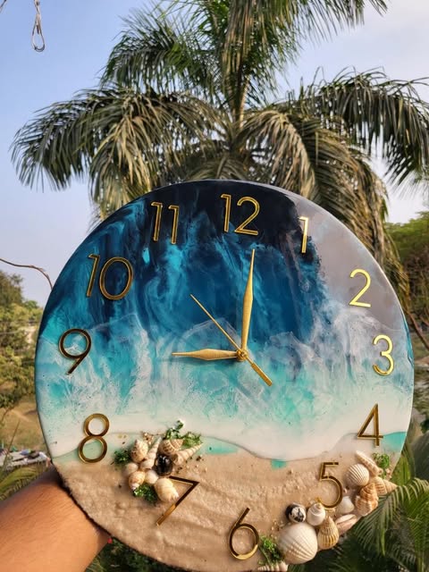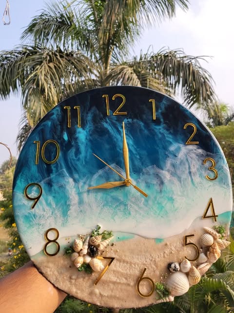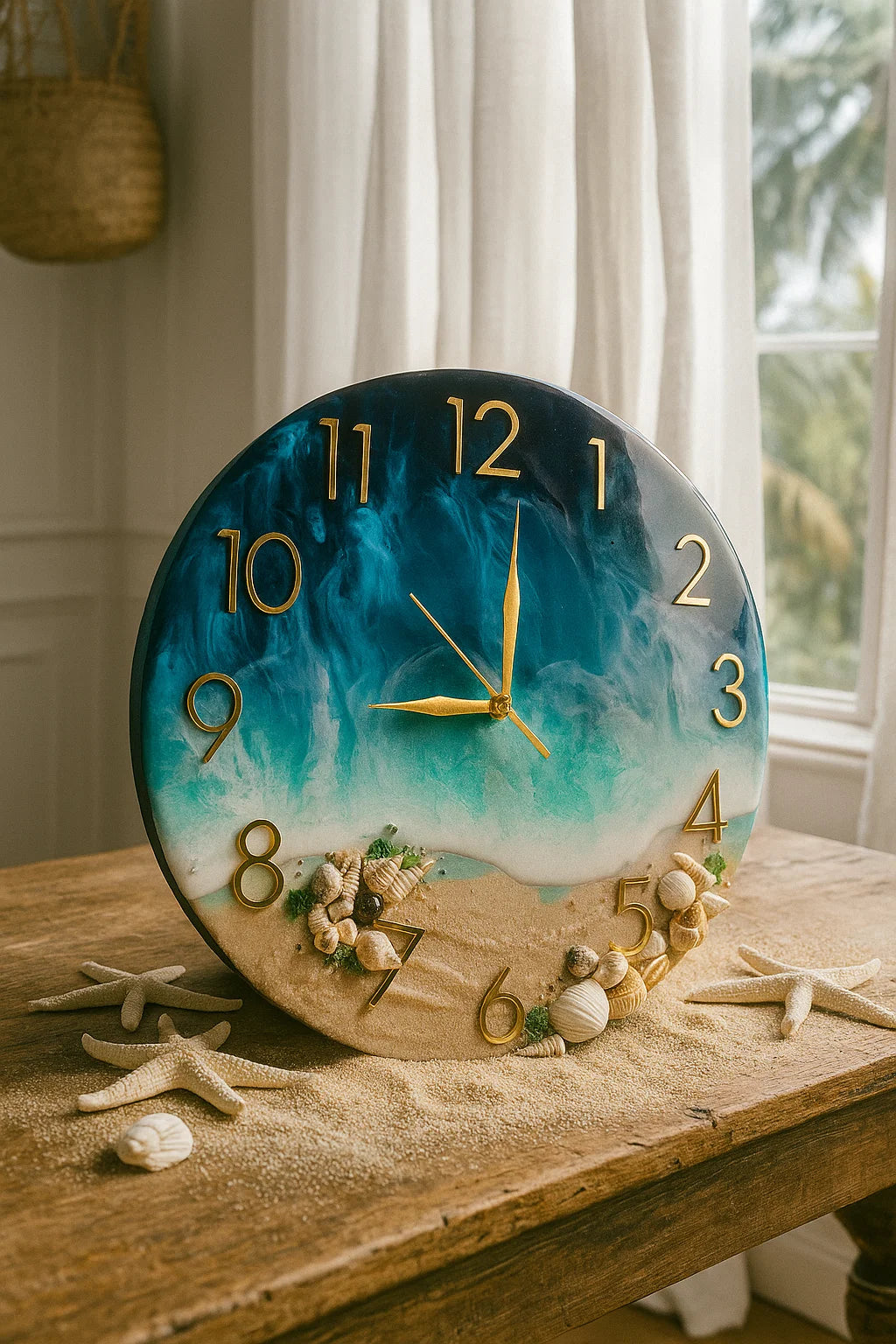 Coastal Hour is where time slows down, like an easy afternoon by the sea. Designed with layered resin art, this wall clock captures the energy of ocean waves crashing into soft, sandy shores. With natural beach textures, shells, and little green touches embedded into the surface, it feels like you're carrying a piece of the coast into your space.