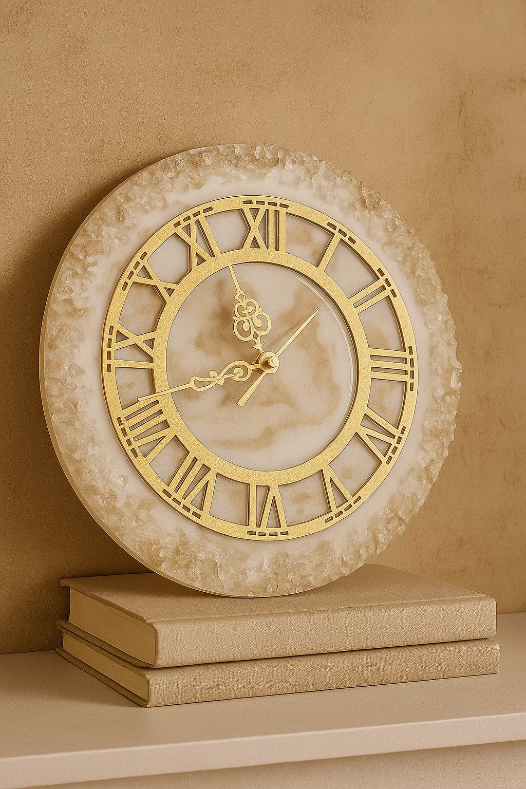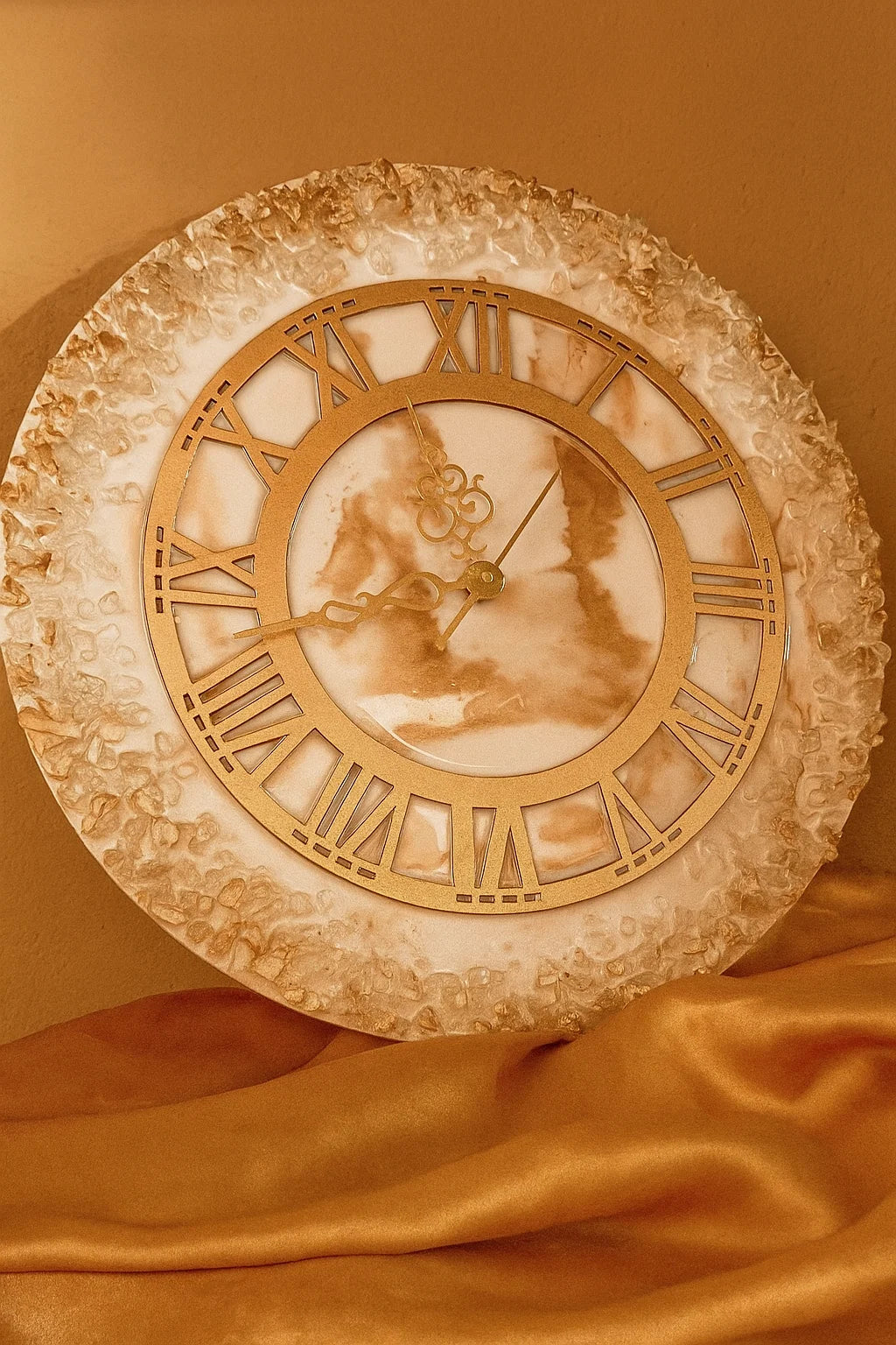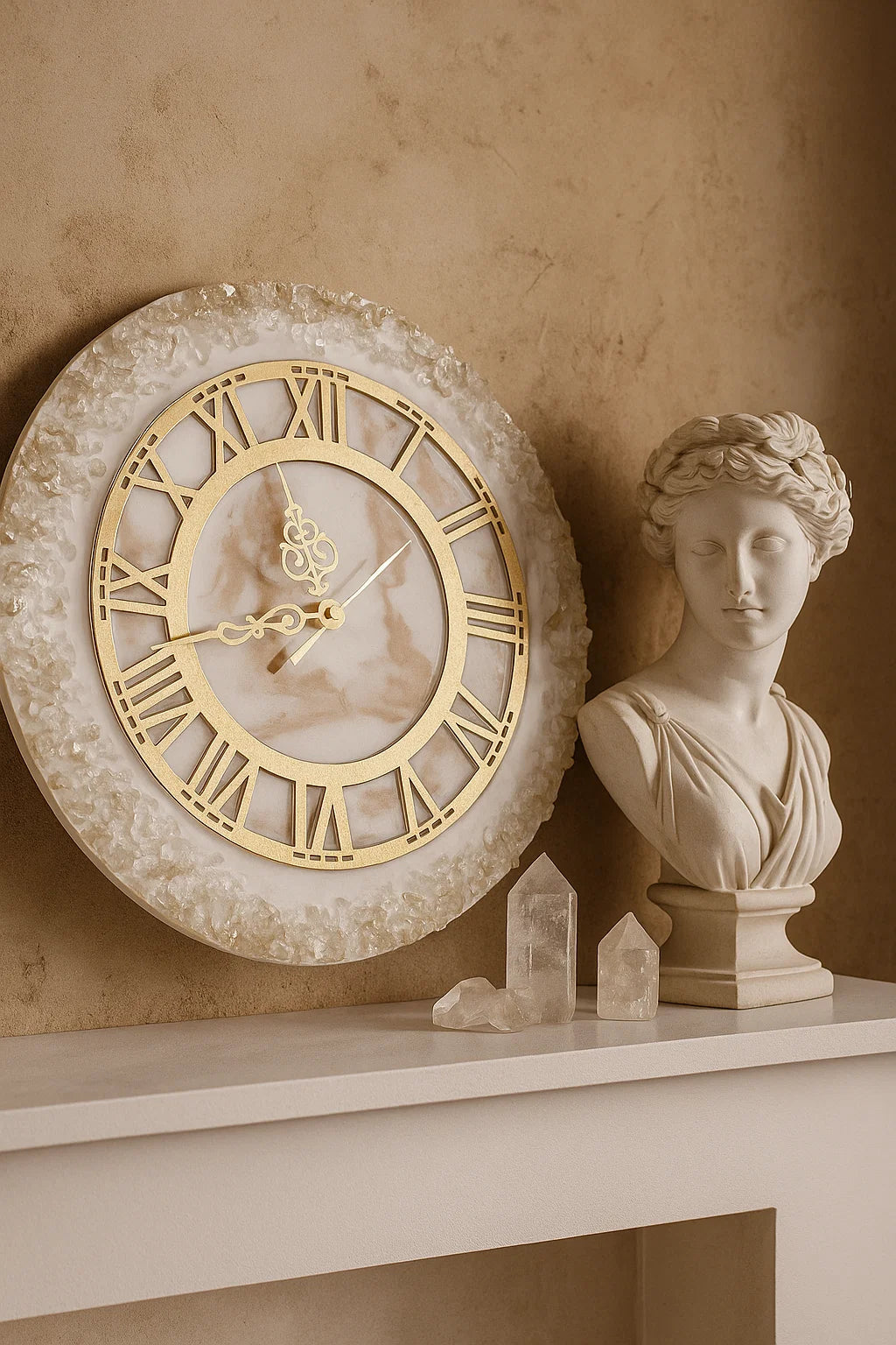 Golden Hour is that perfect mix of modern design and a quiet kind of royalty. With a base of glossy white resin, it flows with delicate marble-like swirls in gold and soft blush pink — just enough to catch the eye, without being loud. The border is finished with crushed clear crystals that reflect light beautifully and give the clock a crown-like glow on the wall.