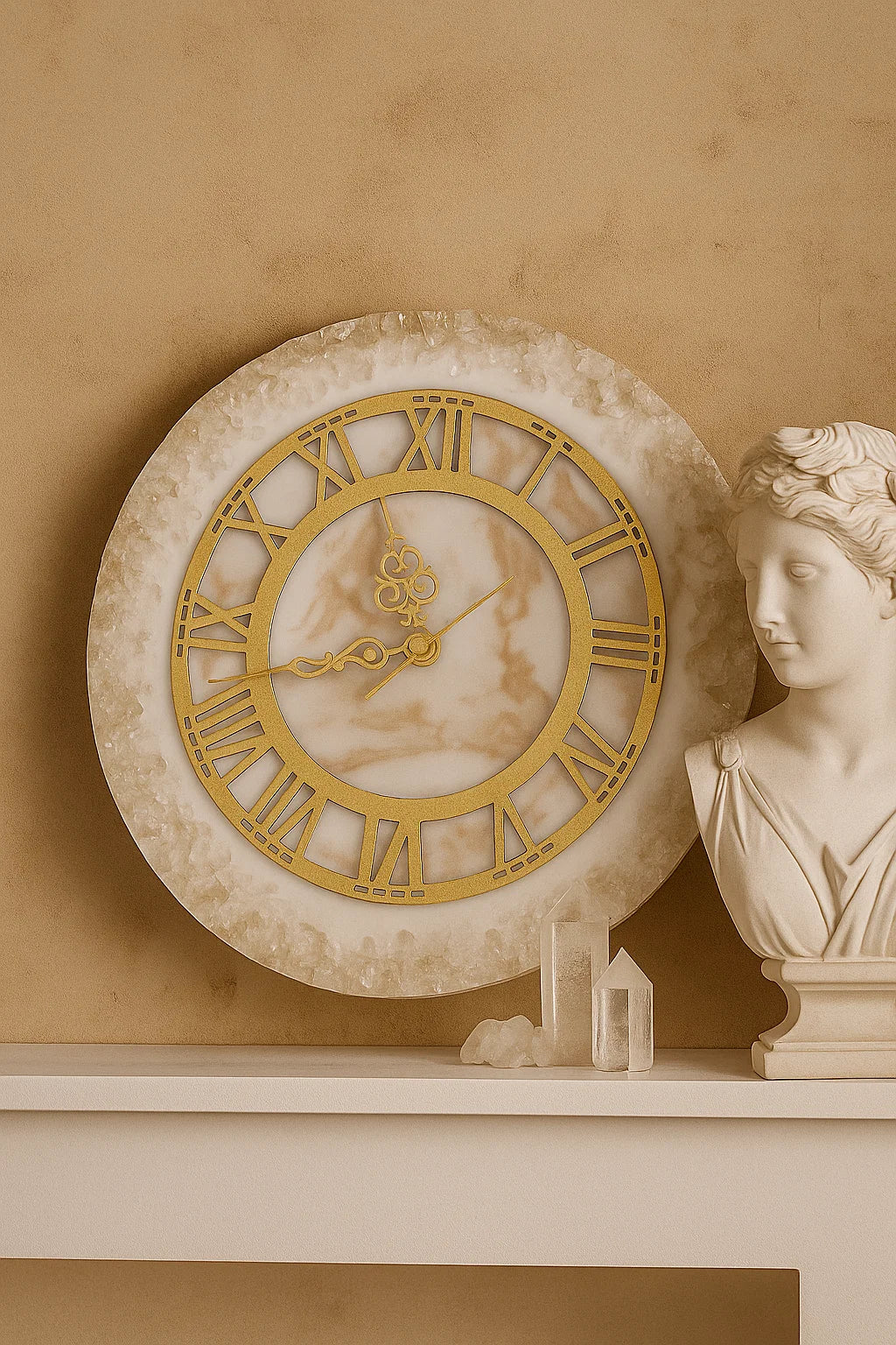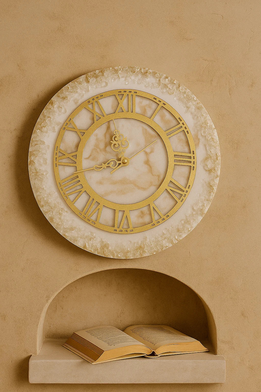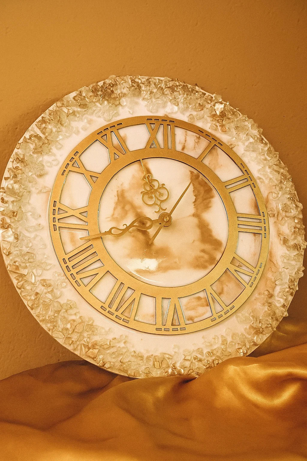 Golden Hour is that perfect mix of modern design and a quiet kind of royalty. With a base of glossy white resin, it flows with delicate marble-like swirls in gold and soft blush pink — just enough to catch the eye, without being loud. The border is finished with crushed clear crystals that reflect light beautifully and give the clock a crown-like glow on the wall.