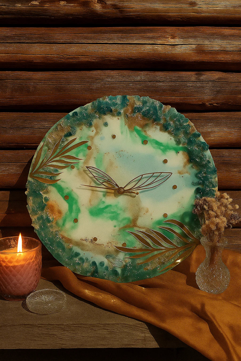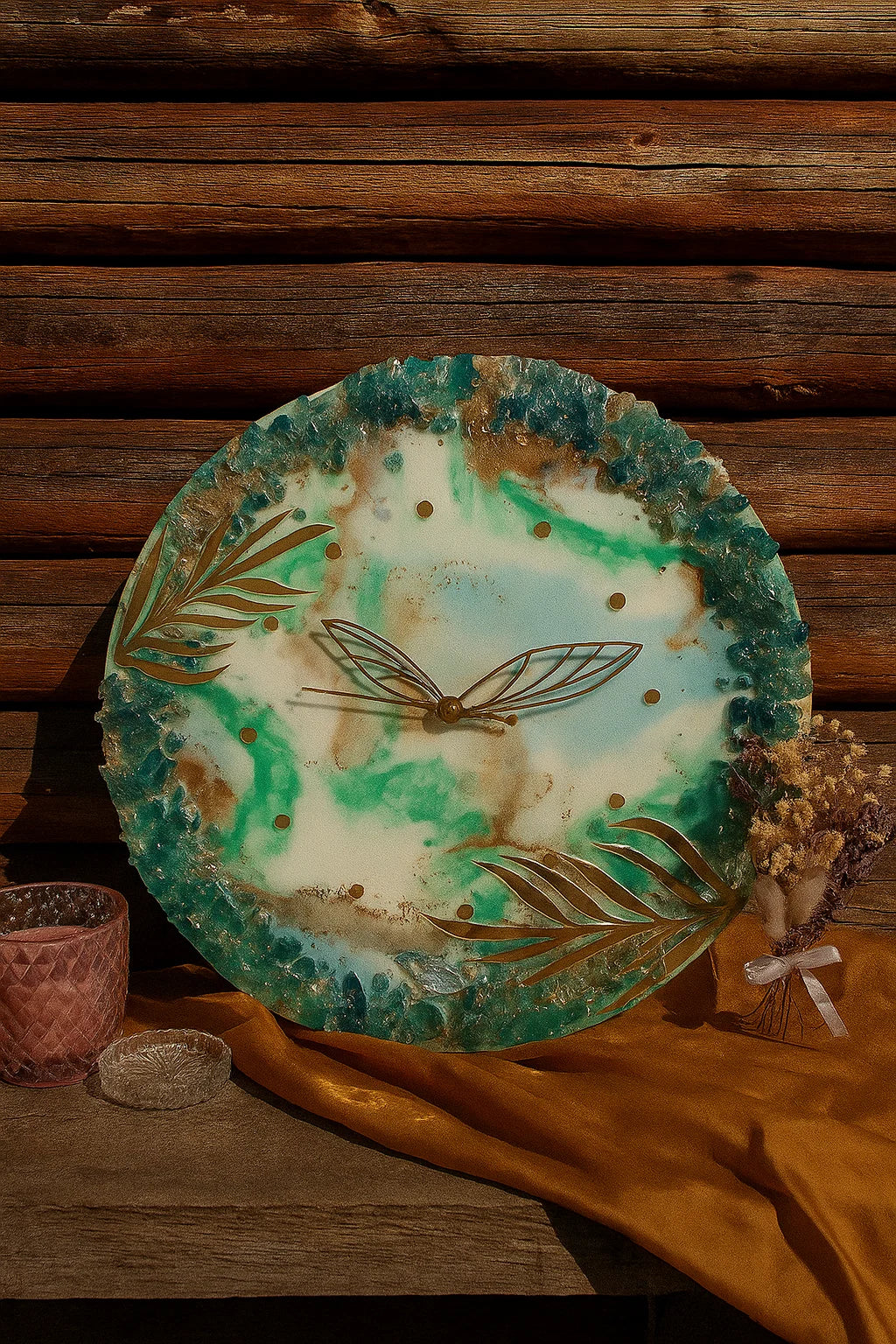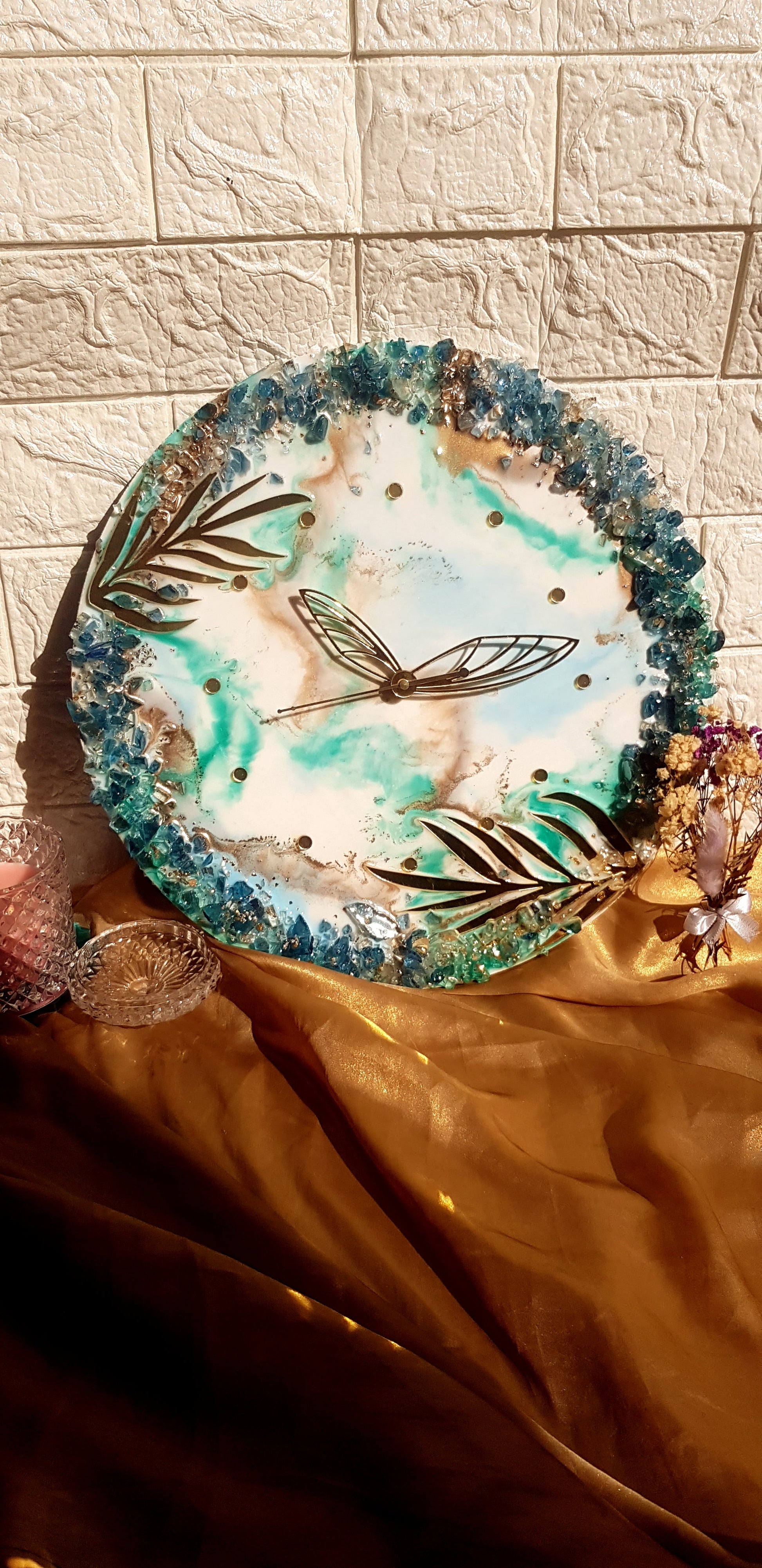 This piece is all about that dreamy, tropical forest energy — soft, lush, and a little whimsical. Tropical Butterfly brings together calming tones of aqua, emerald green, and white resin, surrounded by glimmering crystal edges that catch the light just right.